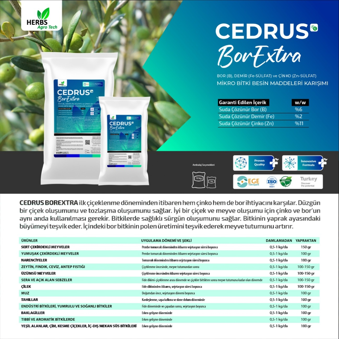 CEDRUS BOREXTRA ilk çiçeklenme döneminden itibaren hem çinko hem de bor ihtiyacını karşılar. Düzgün bir çiçek oluşumunu ve tozlaşma oluşumunu sağlar. İyi bir çiçek ve meyve oluşumu için çinko ve bor'un aynı anda kullanılması gerekir. Bitkilerde sağlıklı sürgün oluşumunu sağlar. Bitkinin yaprak ayasındaki büyümeyi teşvik eder. İçindeki bor bitkinin polen üretimini teşvik ederek meyve tutumunu artırır.