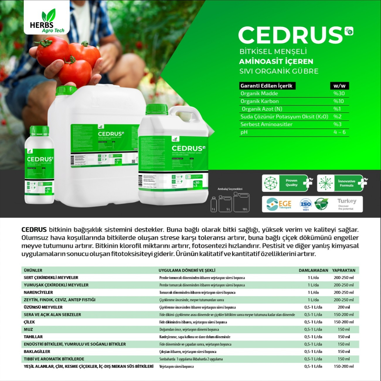 CEDRUS bitkinin bağışıklık sistemini destekler. Buna bağlı olarak bitki sağlığı, yüksek verim ve kaliteyi sağlar. Olumsuz hava koşullarında bitkilerde oluşan strese karşı toleransı artırır, buna bağlı çiçek dökümünü engeller meyve tutumunu artırır. Bitkinin klorofil miktarını artırır, fotosentezi hızlandırır. Pestisit ve diğer yanlış kimyasal uygulamaların sonucu oluşan fitotoksisiteyi giderir. Ürünün kalitatif ve kantitatif özelliklerini artırır.
